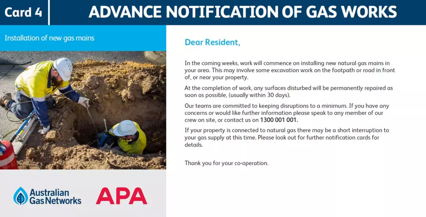 In the coming weeks, work will commence on installing new natural gas mains in your area. This may involve some excavation work on the footpath or road in front of, or near your property.