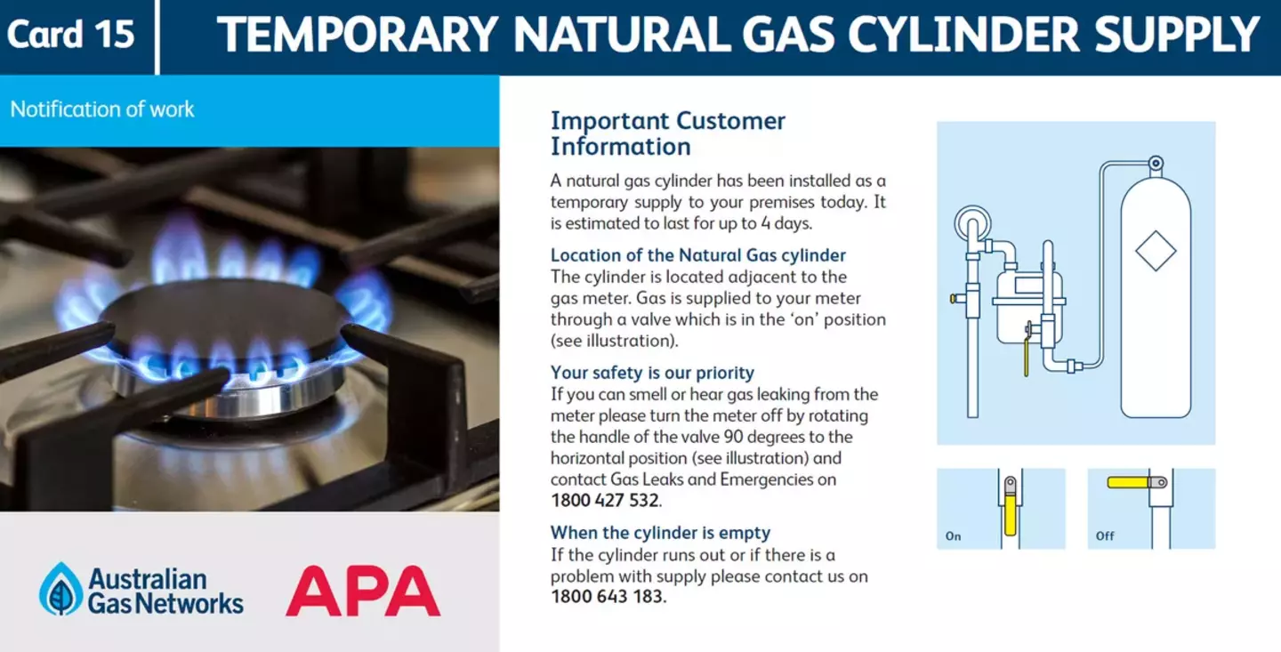 A natural gas cylinder has been installed as a temporary supply to your premises today. It is estimated to last for up to 4 days.