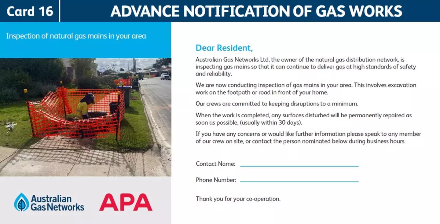 We are now conducting inspection of gas mains in your area. This involves excavation work on the footpath or road in front of your home.